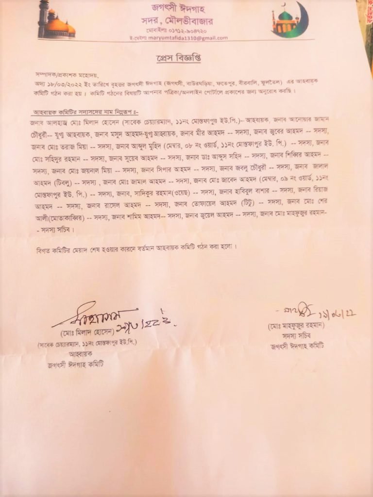 মনজু চৌধুরী॥ মৌলভীবাজার সদর উপজেলার ঐতিহ্যবাহী জগৎসী ঈদগাহের আহ্বায়ক কমিটি গঠন করা হয়েছে।