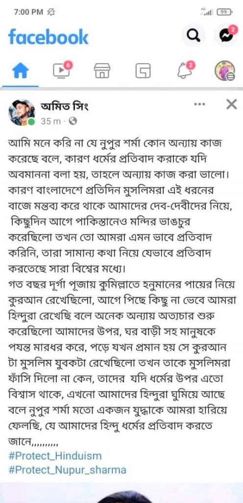 ১২ জুন রোববার রাতে সোসাল মিডিয়ায় নুপুর শর্মাকে সাপোর্ট দিয়ে উস্কানিমূলক পোস্ট দিয়ে সাম্প্রদায়িক দাঙ্গার চেষ্টা করে সে। এতে পোস্টটি মুহুর্তের মধ্যে ভাইরাল হয়ে পড়লে,এলাকার ধর্মপ্রাণ মুসলমানেরা প্রতিবাদে মুখর হয়ে অমিত সিং এর বাসা ঘেরাও করে।