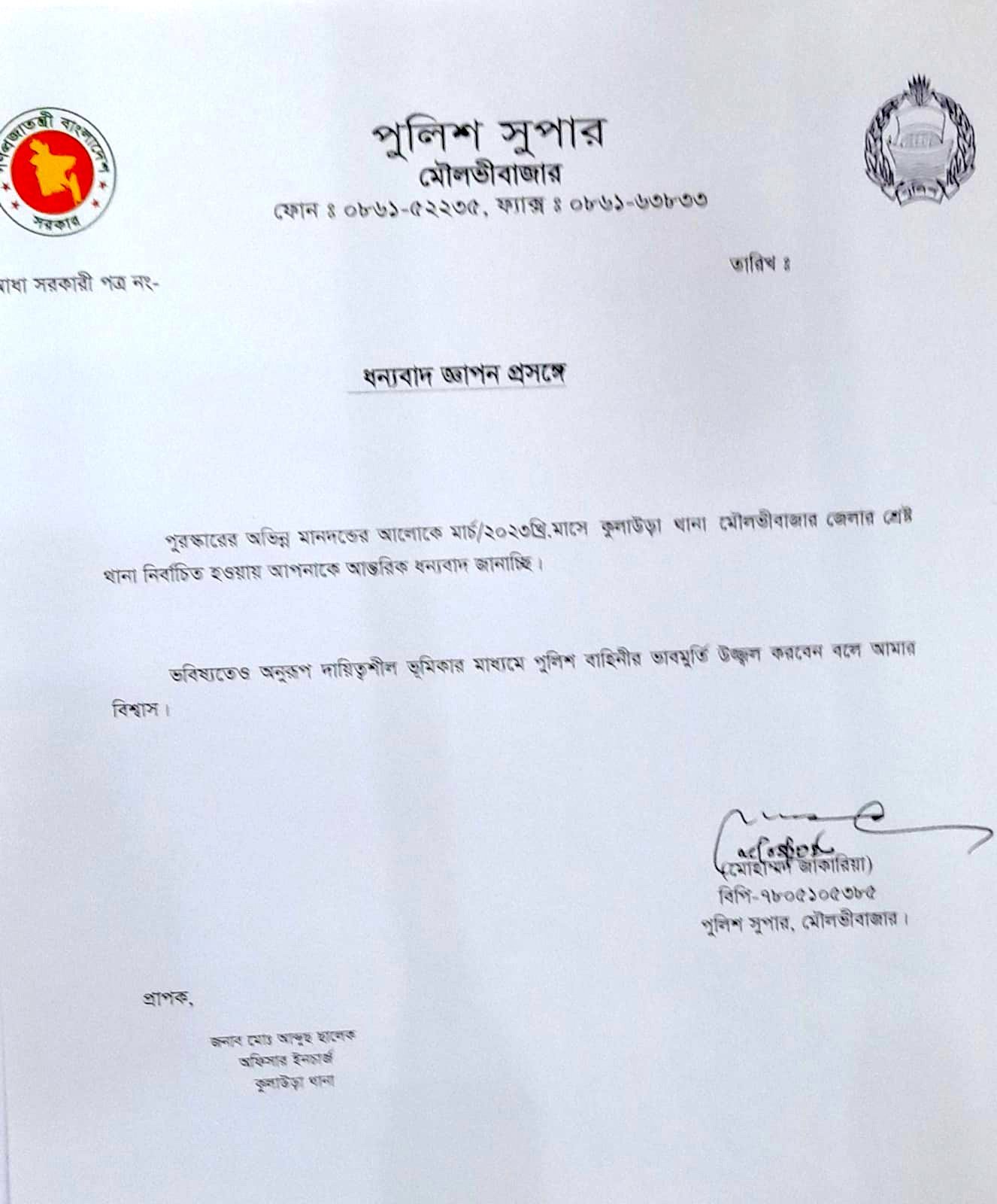 মনজু বিজয় চৌধুরী॥ পুলিশি সেবার মান বৃদ্ধি, থানায় আগত সেবা গ্রহীতাদের মানবিক ভাবে পুলিশি সেবা প্রদান, থানা এলাকার আইন শৃঙ্খলার উন্নতি, ২৪ ঘন্টার ভিতরে দোকান চুরির মামলার রহস্য উদঘাটন করে চোরাইকৃত ১৩টি মোবাইল ও ১টি মনিটর উদ্ধার, চোরাইকৃত মহিষের মাংস উদ্ধার, অবৈধ মাদকদ্রব্য উদ্ধার, মাদকের বিরুদ্ধে জিরো টলারেন্স, বিভিন্ন সামাজিক কার্যক্রম, উঠান বৈঠক ও বিট পুলিশিং কার্যক্রম জোরদার, ওয়ারেন্ট তামিল, নারী নির্যাতন ও ইভটিজিং রোধ, দাগী অপরাধীদের গ্রেফতার পূর্বক চুরি-ডাকাতি রোধ, ক্লুলেস মামলার রহস্য উদঘাটনসহ আইন-শৃঙ্খলা পরিস্থিতি স্বাভাবিক রাখার জন্য মার্চ ২০২৩ সাল মাসে ৫ম বারের মত মৌলভীবাজার জেলার শ্রেষ্ঠ ওসি নির্বাচিত হয়েছেন কুলাউড়া থানার অফিসার ইনচার্জ(ওসি) জনাব মোঃ আব্দুছ ছালেক এবং শ্রেষ্ঠ এএসআই হিসেবে নির্বাচিত হয়েছেন কুলাউড়া থানার মোঃ বিল্লাল হোসেন। পুরষ্কার হিসেবে মাননীয় পুলিশ সুপার মহোদয় অফিসার ইনচার্জ জনাব মোঃ আব্দুছ ছালেক ব এর হাতে ক্রেস্ট ও ধন্যবাদপত্র তুলে দেন।
