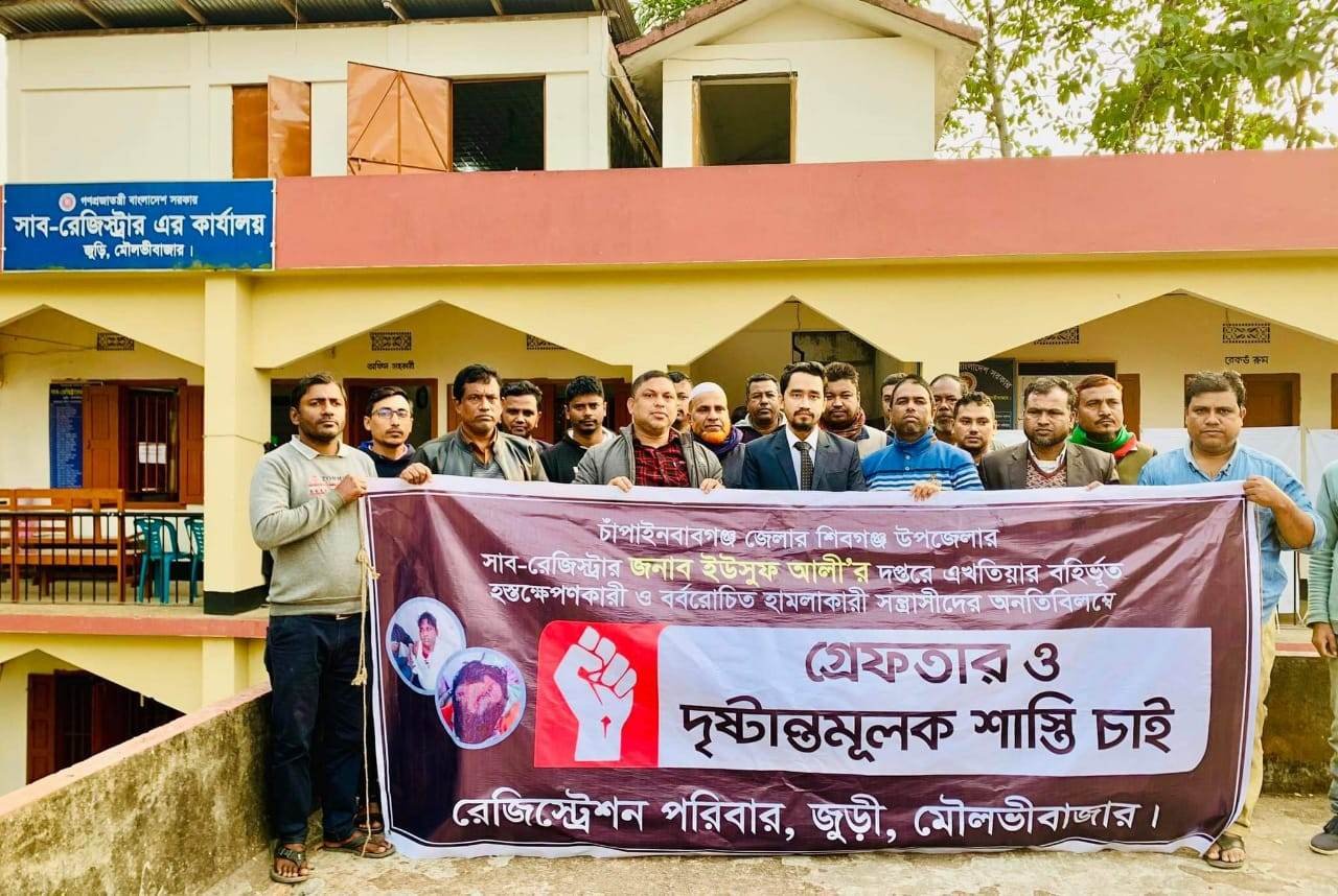 ডায়াল সিলেট ডেস্ক ॥ চাঁপাইনবাবগঞ্জের শিবগঞ্জ উপজেলা সাবরেজিস্টারের ওপর নৃশংস হামলার প্রতিবাদে মৌলভীবাজারের জুড়ীতে হামলাকারীদেরশাস্তির দাবীতে মানববন্ধন কর্মসূচি পালিত হয়েছে।