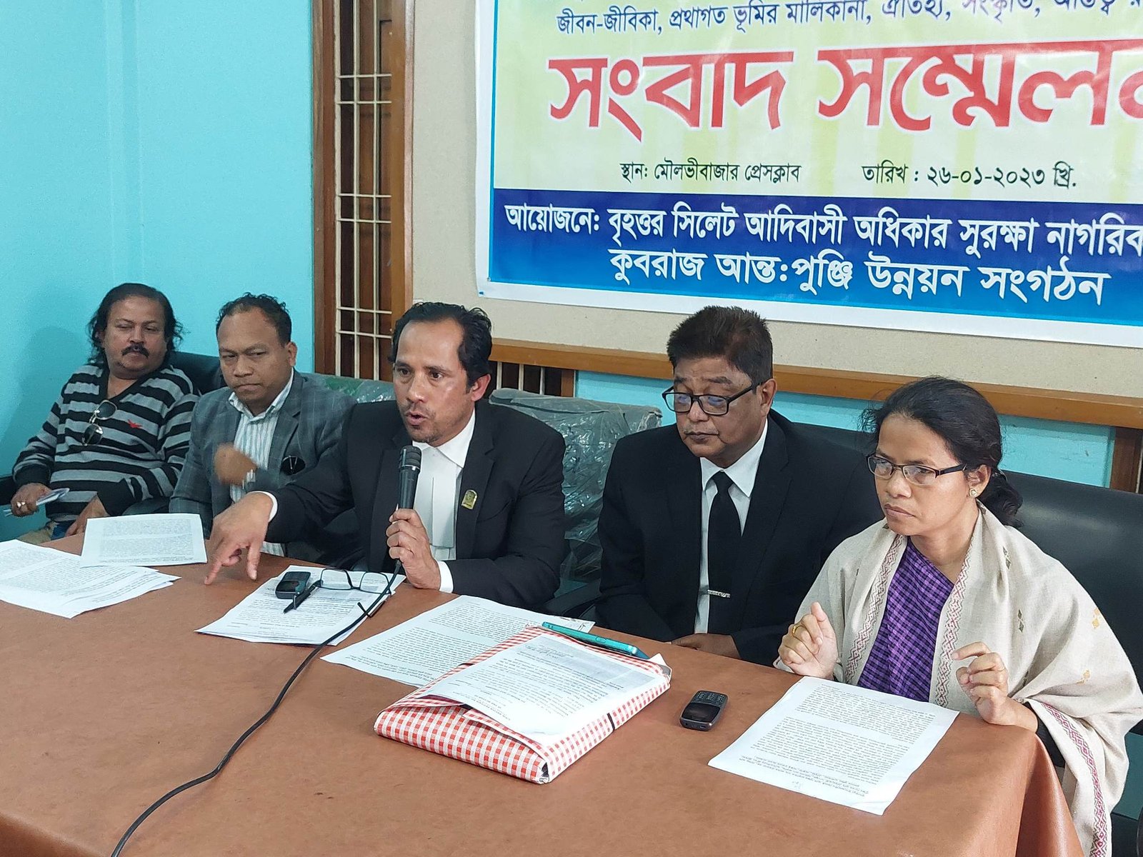 সাংবাদ সম্মেলনে জানানো হয়… বৃহত্তর সিলেট আদিবাসী অধিকার সুরক্ষা নাগরিক কমিটি এবং কুবরাজ আন্তঃপুঞ্জি উন্নয়ন সংগঠনের পক্ষ থেকে অদ্যকার সংবাদ সম্মেলনে অংশগ্রহণকারী সকল প্রিন্ট, ইলেকট্রনিক ও অনলাইন সাংবাদিক, বিভিন্ন সামাজিক, সাংস্কৃতিক সংগঠন ও শ্রেণী পেশার নেতৃস্থানীয় প্রতিনিধিদের অভিনন্দন ও কৃতজ্ঞতা জানাই। আপনারা অবগত আছেন মৌলভীবাজার জেলার পাহাড়ি বনাঞ্চলে প্রায় ৮০টি খাসি পুঞ্জি রয়েছে, যেখানে প্রধানত খাসি ও গারো আদিবাসীরা স্মরনাতীত কাল থেকে প্রাণ-প্রকৃতি, পরিবেশের ভারসাম্য রক্ষা করে বিশেষ কৃষিপদ্ধতিতে পানচাষ করে নিজেদের জীবন জীবিকা ও অস্তিত্ব রক্ষা করে দেশের অর্থনৈতিক প্রবাহে গুরুত্বপূর্ণ অবদান রেখে আসছেন। প্রায় প্রতিটি পুঞ্জিতেই সহস্রাধিক বাঙ্গালী জনগোষ্ঠী পান চাষ, সংগ্রহ, পরিবহন ও বাজারজাতকরন প্রক্রিয়ার সাথে যুক্ত এবং রোজগারের একমাত্র অবলম্বন। দুর্গম পাহাড়ী অঞ্চলে এই আদিবাসীরা শিক্ষা, স্বাস্থ্যসেবা, বিশুদ্ধ খাবার পানি, উন্নত যোগাযোগ ব্যবস্থা, বিদ্যুৎ সংযোগ বিহীন অবস্থায় যুগ যুগ ধরে কঠিন কষ্টকর সংগ্রাম করে নিজেদের অস্তিত্ব রক্ষা করে আসছেন। এই আদিবাসীরা বংশপরম্পরায় মৌলভীবাজারের এই বিস্তীর্ণ বনভূমিতে বসবাস করে আসলেও স্বাধীন বাংলাদেশের ৫১ বছর পরেও প্রথাগত ও ঐতিহ্যগত ভূমিতে তাদের মালিকানা স্বীকৃত হয়নি। আদিবাসীদের ভোগদখলীয় এই বনভুমি কাগজে পত্রে জেলা প্রশাসক এবং বনবিভাগের নামে হওয়ার কারণে দীর্ঘদিন যাবত বনবিভাগ ও চা বাগান কর্তৃপক্ষের সাথে বিভিন্ন মামলা মোকদ্দমা, বনবিভাগ কর্তৃক খাসিদের উচ্ছেদ করার লক্ষ্যে মিথ্যা বনমামলা দায়ের করে হয়রানি, খাসিদের ভোগদখলীয় প্রাকৃতিক বনে সামাজিক বনায়ন প্রকল্প গ্রহণ করে স্থানীয় প্রভাবশালী ভুমিখেকোদের সম্পৃক্ত করে আদিবাসীদের সাথে সংঘাতময় পরিস্থিতি এখানকার বর্তমান বাস্তব চিত্র। প্রিয় সাংবাদিকবৃন্দ, আজকের এই সংবাদ সম্মেলনে আমরা ঝিমাই পুঞ্জির সাথে ঝিমাই চা বাগান (কেদারপুর টি কোম্পানী লিঃ) এর চলমান ভুমি বিরোধ, ঝিমাই চা বাগান কর্তৃক ঝিমাই পুঞ্জির পানজুমের আওতাধীন প্রায় দুই সহস্রাধিক প্রাকৃতিক গাছ কাটার প্রচেষ্টা, পুঞ্জিতে বসবাসরত আদিবাসীদের বসতভিটা, বিদ্যালয়, গীর্জা, কবরস্থান সর্বোপরি তাদের জীবন জীবিকা বিপন্ন হওয়ার এবং বিশ্বব্যাপি জলবায়ু পরিবর্তনের জটিল প্রেক্ষাপটে প্রাণ- প্রকৃতি, পরিবেশের বিপর্যয়ের আশংকা তৈরি হওয়ায় আমরা অত্যন্ত উদ্বেগ প্রকাশ করছি। শতাধিক বছর ধরে এই পুঞ্জিতে খাসি আদিবাসীরা বসবাস করলেও ২০০৮ সালে প্রথম ঝিমাই চা বাগান কর্তৃপক্ষ ঝিমাই পুঞ্জির দখলীয় ভুমির একাংশ নিজেদের লীজভুক্ত দাবি করেন এবং পানজুমের আওতাভুক্ত প্রাকৃতিক দুই সহস্রা