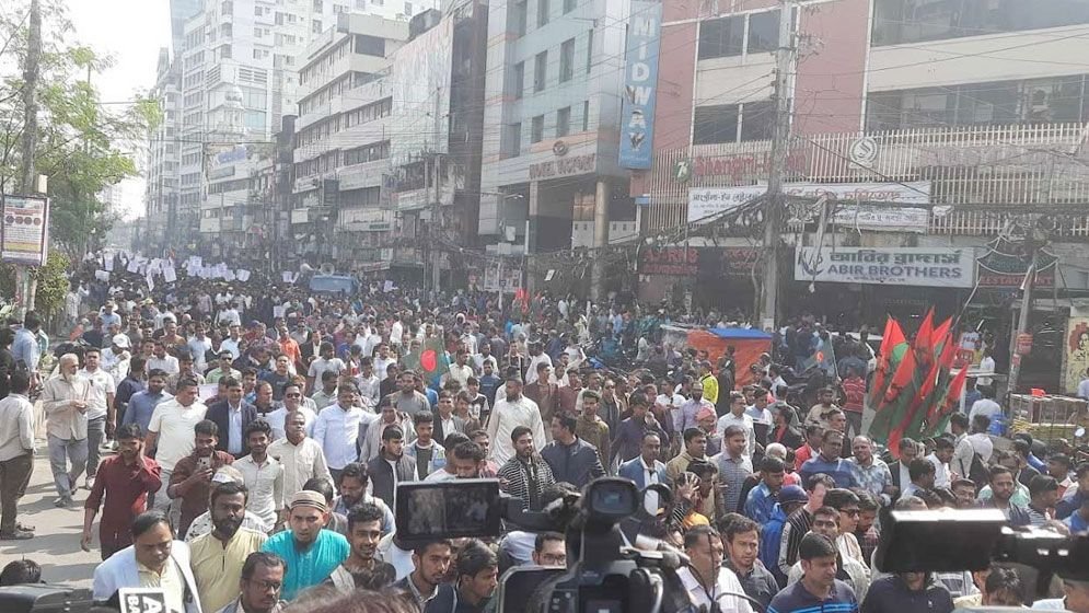 ডায়ালসিলেট ডেস্ক:ঢাকায় ভারতীয় হাইকমিশন অভিমুখে প্রতিবাদ পদযাত্রা ও স্মারকলিপি দেওয়ার পর ঢাকা টু আখাউড়া লংমার্চ কর্মসূচি করতে যাচ্ছে বিএনপির তিন অঙ্গ ও সহযোগী সংগঠন। আগামী বুধবার তারা ঢাকা থেকে লংমার্চ শুরু করবে। আগরতলার এ পাড়ে বাংলাদেশ সীমান্তের আখাউড়া পর্যন্ত লংমার্চ অনুষ্ঠিত হবে।বিএনপির তিন অঙ্গ-সহযোগী সংগঠনের নেতাদের সঙ্গে কথা বলে এ তথ্য জানা গেছে। আজ অথবা কাল আনুষ্ঠানিকভাবে সংবাদ বিজ্ঞপ্তি দিয়ে এ কর্মসূচি ঘোষণা করার কথা রয়েছে।জানা গেছে, শনিবার রাতে বিএনপির গুলশান কার্যালয়ে বিএনপির ভারপ্রাপ্ত চেয়ারম্যান তারেক রহমানের সঙ্গে ভার্চুয়ালি বৈঠক করেন যুবদল, স্বেচ্ছাসেবক দল ও ছাত্রদলের শীর্ষ নেতারা। সেই বৈঠকে এই সিদ্ধান্ত হয়।ভারতের আগরতলায় বাংলাদেশের সহকারী হাইকমিশনে হামলা, বাংলাদেশের জাতীয় পতাকা অবমাননা ও সাম্প্রদায়িক দাঙ্গা বাধানোর ষড়যন্ত্রের প্রতিবাদে এ কর্মসূচি করবে বিএনপির তিন সংগঠন।নয়াপল্টন থেকে গাড়িবহর নিয়ে আখাউড়া যাবেন নেতাকর্মীকর্মীরা। পথিমধ্যে জেলা নেতারা যোগ দেবেন। আখাউড়ায় একটি সমাবেশ করা হবে।রোববার বেলা ১১টা ২৫ মিনিটে রাজধানীর নয়াপল্টন বিএনপির কেন্দ্রীয় কার্যালয়ের সামনে থেকে জাতীয়তাবাদী যুবদল, স্বেচ্ছাসেবক দল ও ছাত্রদলের যৌথ উদ্যোগে প্রতিবাদ পদযাত্রা ও স্মারকলিপি প্রদান কর্মসূচি শুরু হয়। দুপুরে ভারতীয় হাইকমিশনে স্মারকলিপি দেন নেতারা।কর্মসূচিকে কেন্দ্র করে সকাল সাড়ে ৯টা থেকে জাতীয়তাবাদী যুবদল, স্বেচ্ছাসেবক দল ও ছাত্রদলের হাজার হাজার নেতাকর্মী খন্ড খণ্ড মিছিল নিয়ে নয়াপল্টনে জড়ো হতে শুরু করেন। এ সময় তারা ‘দিল্লি না ঢাকা, ঢাকা ঢাকা’, ‘ভারতের দালালেরা, হুঁশিয়ার সাবধান’সহ বিভিন্ন স্লোগানে রাজপথ মুখরিত করে তোলেন। সংগঠন তিনটির নেতাকর্মীদের মাথায় জাতীয় পতাকা বেঁধে এবং হাতে ফেস্টুন, জাতীয় পতাকা ও দলীয় পতাকা নিয়ে কর্মসূচিতে অংশ নিতে গেছে।যুবদলের সভাপতি আবদুল মোনায়েম মুন্নার সভাপতিত্বে এবং ছাত্রদলের সাধারণ সম্পাদক নাছির উদ্দীন নাছিরের সঞ্চালনায় পদযাত্রাপূর্ব সংক্ষিপ্ত সমাবেশে বক্তব্য রাখেন বিএনপির সিনিয়র যুগ্ম মহাসচিব রুহুল কবির রিজভী, যুবদলের সাধারণ সম্পাদক নূরুল ইসলাম নয়ন, স্বেচ্ছাসেবক দলের সভাপতি এসএম জিলানী, ছাত্রদলের সভাপতি রাকিবুল ইসলাম রাকিব। এছাড়া কর্মসূচিতে স্বেচ্ছাসেবক দলের সাধারণ সম্পাদক রাজিব আহসান, সাংগঠনিক সম্পাদক নাজমুল হাসানসহ সংগঠন তিনটির হাজার হাজার নেতাকর্মী উপস্থিত আছেন।