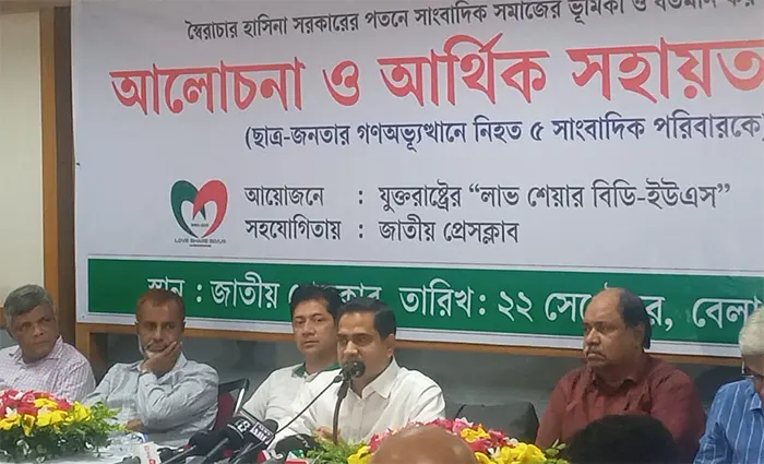 Thank you for reading this post, don't forget to subscribe!রোববার জাতীয় প্রেসক্লাবে যুক্তরাষ্ট্রের “লাভ শেয়ার বিডি-ইউএস” এর উদ্যোগে ‘স্বৈরাচার হাসিনা সরকারের পতনে সাংবাদিক সমাজের ভূমিকা ও বর্তমান করণীয়’ শীষর্ক এক আলোচনা এবং আর্থিক সহায়তা প্রদান অনুষ্ঠানে তিনি এ অভিযোগ করেন। অনুষ্ঠানে ছাত্র-জনতার গণঅভ্যুত্থানে নিহত ৫ সাংবাদিক পরিবারকে আর্থিক সহায়তা দেয়া কথা ছিলো। তবে দু’টি পরিবারের সদস্যরা উপস্থিত না থাকায় তিন পরিবারের হাতে আর্থিক সহায়তা প্রদান করা হয়। বাকি দু’টি পরিবারের কাছে আর্থিক সহায়তা পৌঁছে দেয়া হবে বলে আয়োজকদের পক্ষ থেকে জানানো হয়েছে।