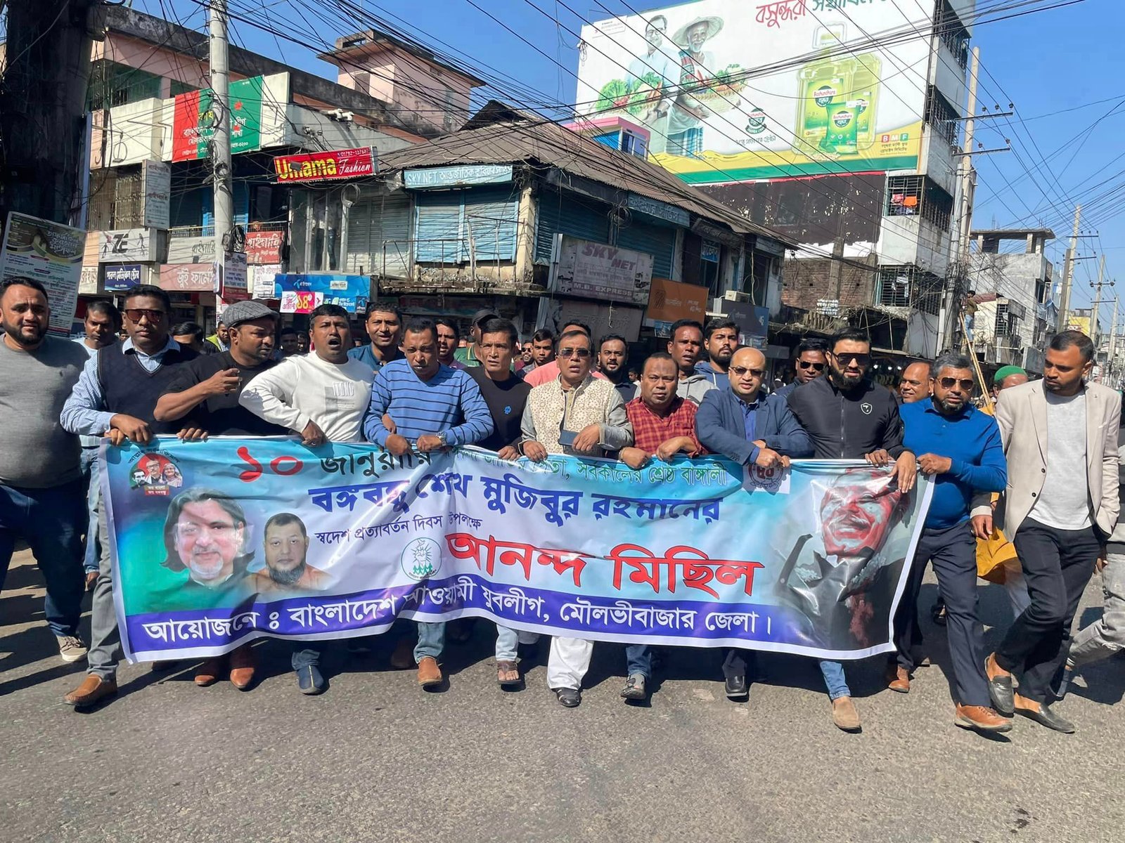 মনজু বিজয় চৌধুরী: জাতির পিতা বঙ্গবন্ধু শেখ মুজিবুর রহমানের ঐতিহাসিক স্বদেশ প্রত্যাবর্তন দিবস উপলক্ষে মৌলভীবাজারে আনন্দ মিছিল করেছে জেলা যুবলীগ।
