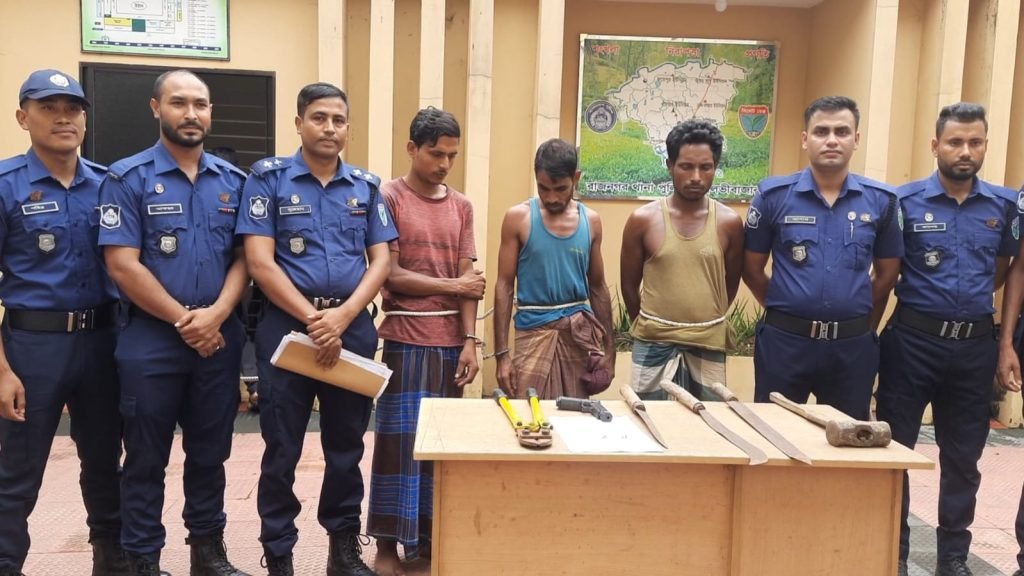 মনজু বিজয় চৌধুরী॥  মৌলভীবাজার জেলার রাজনগর থানা পুলিশের বিশেষ অভিযানে দেশীয় অস্ত্র এবং ডাকাতির মালামালসহ আন্তঃজেলা ডাকাত দলের ০৩ সদস্যকে গ্রেফতার করা হয়েছে। ২৭ আগস্ট  দুপুরে মৌলভীবাজার পুলিশ সুপারের কার্যালয়ের সম্মেলন কক্ষে জেলা পুলিশ আয়োজিত এক প্রেস ব্রিফিংয়ে পুলিশ সুপার মোঃ মনজুর রহমান পিপিএম (বার) সাংবাদিকদের এসব তথ্য জানান।  ২৪ আগস্ট,  রাত অনুমান ০২.৩০ ঘটিকার সময় রাজনগর থানাধীন ০২নং উত্তরভাগ ইউপিস্থ পশ্চিম লালাপুর গ্রামের মৃত সিরাজ মিয়ার স্ত্রী জনৈকা আমিরুন নেছার (৫৫) বসত ঘরের বারান্দার কলাপসিবল গেইটের তালা  কেটে ও রুমের ছিটকারি  ভেঙ্গে অজ্ঞাতনামা ৬/৭ জন লোক দেশীয় অস্ত্রসহ প্রবেশ করে ঘরের লোকদের হাত-পা বেধে নগদ ২০,০০০/- টাকা ও স্বর্ণালংকারসহ মোট ৬,২০,০০০/- টাকার মালামাল লুট করে।