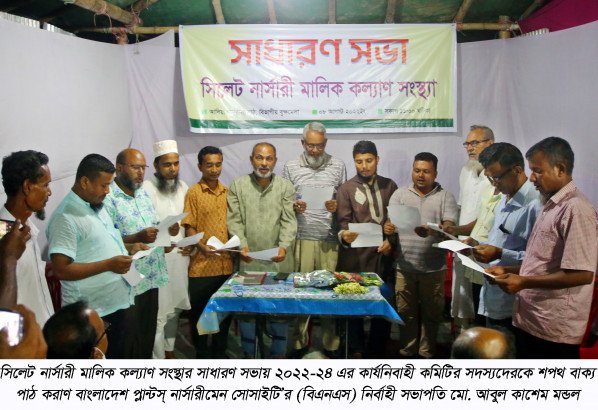 সিলেট নার্সারী মালিক কল্যাণ সংস্থার নবনির্বাচিত সভাপতি আলমগীর আহমদের সভাপতিত্বে ও সাধারণ সম্পাদক মলয় লাল ধর এর পরিচালনায় অনুষ্ঠিত সাধারণ সভা ও শপথ গ্রহন অনুষ্ঠানে উপস্থিত ছিলেন, বিএনএস’র সহ সাধারণ সম্পাদক প্রোকৌশলী মো. গোলাম হায়দার, সহ সাধারণ সম্পাদক-২ মো. মাসুদ রেজা, সাংগঠনিক সম্পাদক সংগ্রাম কুমার বুদ্ধ। সিলেট নার্সারী কল্যাণ সংস্থার সভাপতি ও সাধারণ সম্পাদক সহ সংস্থার সিনিয়র সহ সভাপতি ইকবাল হোসেন মোক্তার, সহ সভাপতি রবীন্দ্র ধর, মহিউদ্দিন, যুগ্ম সাধারণ সম্পাদক নুরুল কাদির সিদ্দিকী, কোষধ্যক্ষ গোলাম কিবরিয়া, সাংগঠনিক সম্পাদক তরিকুল ইসলাম, দপ্তর ও প্রচার সম্পাদক আমির আলী, শিক্ষা ও ক্রিড়া সম্পাদক খালেদুর রহমান চৌধুরী, সাংস্কৃতিক ও সমাজ কল্যাণ সম্পাদক মুজিবুর রহমান, কার্যনির্বাহী সদস্য বিমল সরকার, নাসির উদ্দিন, আবুল হোসেন ও আব্দুর রব শপথ গ্রহণ করেন। বিজ্ঞপ্তি।