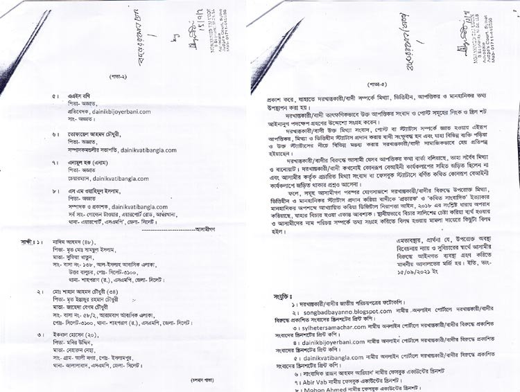 মামলার অভিযুক্ত আসামীরা হলেন, সিলেট নগরীর উত্তর বালুচর আল ইসলাহ ১১০ নম্বর বাসার আওলাদ আলীর ছেলে মোহন আহমদ, খরাদিপাড়া আনন্দ ৮/এ বাসার রফিকুল ইসলাম বাচ্চুর স্ত্রী সৈয়দা কবিরুন নেছা, শাহপরান মোকামেরগুলের শফিক মিয়ার ছেলে রাজন আহমদ আরিয়ান, সিলেটের সমাচার ডটকম এর প্রতিবেদক তুহিনুর রহমান শাহ্জাহান, দৈনিক বিজয়ের বাণী ডটকম এর প্রতিবেদক এএইস রণি, দৈনিক ভাটি বাংলা ডটকমের সম্পাদকমন্ডলীর সভাপতি তোফায়েল আহমদ চৌধুরী, দৈনিক ভাটি বাংলা ডটকমের চেয়ারম্যান এনামুল হক (এনাম), ও দৈনিক ভাটি বাংলা ডটকমের সম্পাদক ও প্রকাশক এস এম ওয়াহিদুল ইসলাম।