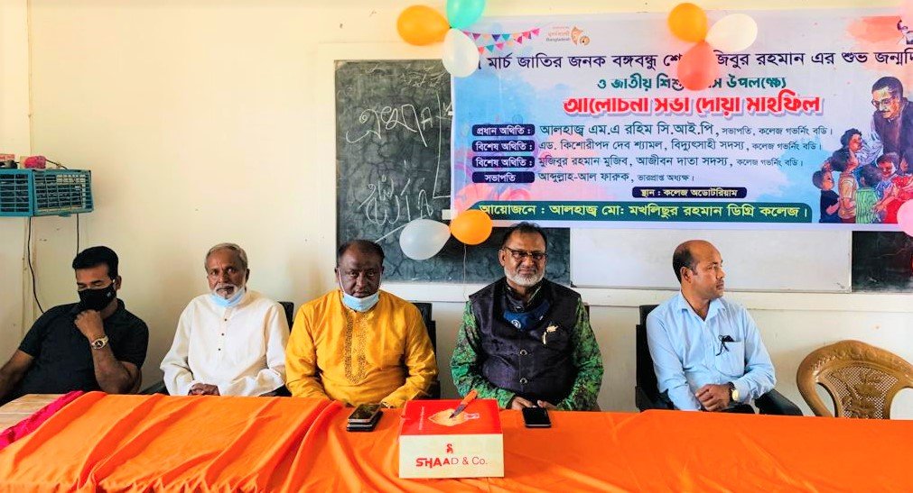 মনজু চৌধুরী॥ জাতির পিতা বঙ্গবন্ধু শেখ মুজিবুর রহমানের ১০২তম জন্মবার্ষিকী ও জাতীয় শিশু দিবস পালন করেছে আলহাজ্ব মো. মখলিছুর রহমান ডিগ্রী কলেজ। ১৭ মার্চ বৃহস্পতিবার জাতীয় শিশু দিবস ও জাতির পিতা বঙ্গবন্ধু শেখ মুজিবুর রহমানের জন্ম দিন উপলক্ষে সদর উপজেলার নাজিরাবাদ ইউনিয়নের রাতগাঁও আলহাজ্ব মো: মখলিছুর রহমান ডিগ্রী কলেজ কর্তৃক আয়োজিত আলোচনা সভা ও দোয়া মাহফিল অনুষ্ঠিত। সভার শুরুতে নতুন জাতীয় পতাকা উত্তোলন ও ঙ্গবন্ধুর প্রতিকৃতিতে পুষ্পস্তবক অর্পণ করা হয়।